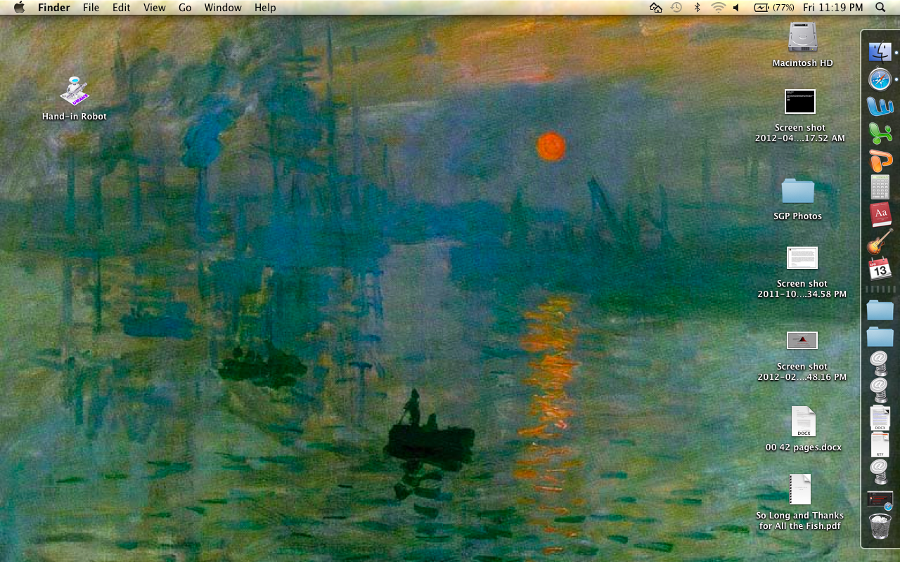 I actually have a total clusterfuck of icons, but I've got Fences installed so I can double click to make it all disappear. Which is neat.